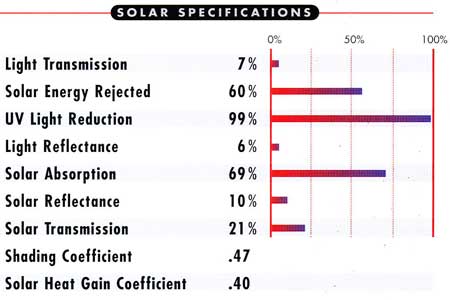 The Independent Laboraories DSET has performed all solar specifications testing. Film was mounted on 1/4" glass and claculations were accomplished using Lawrence Berkeley Lab's "Window 4.1" program utilizing NFRC and ASHRAE standards. Data value expressed hereof are typical and provided for comarative purposes only. |